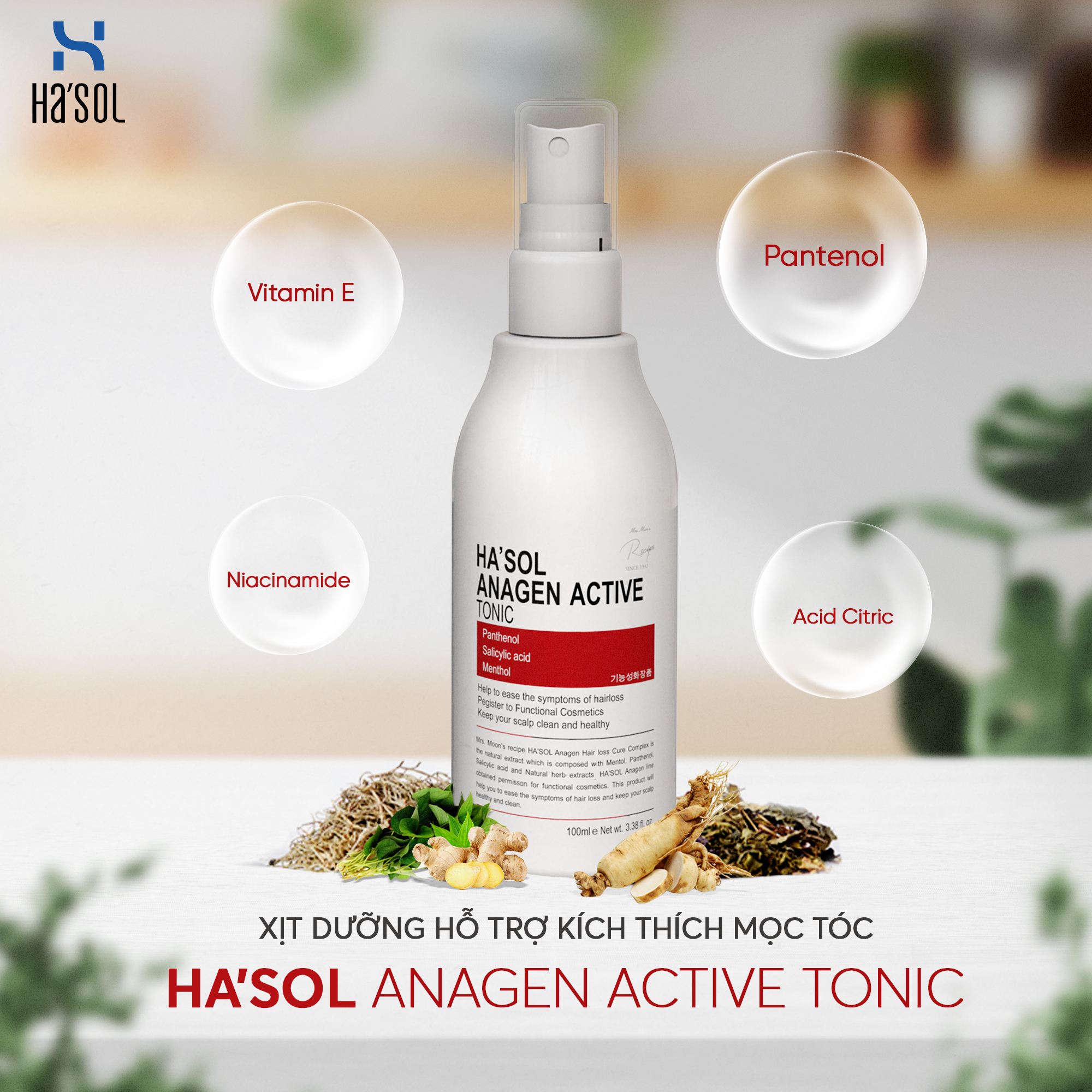 - Xịt dưỡng tóc Ha'sol Anagen Active Tonic (Màu đỏ): dành cho tóc rụng, mỏng và yếu, ngăn ngừa rụng tóc và hỗ trợ kích thích mọc tóc tối đa.
