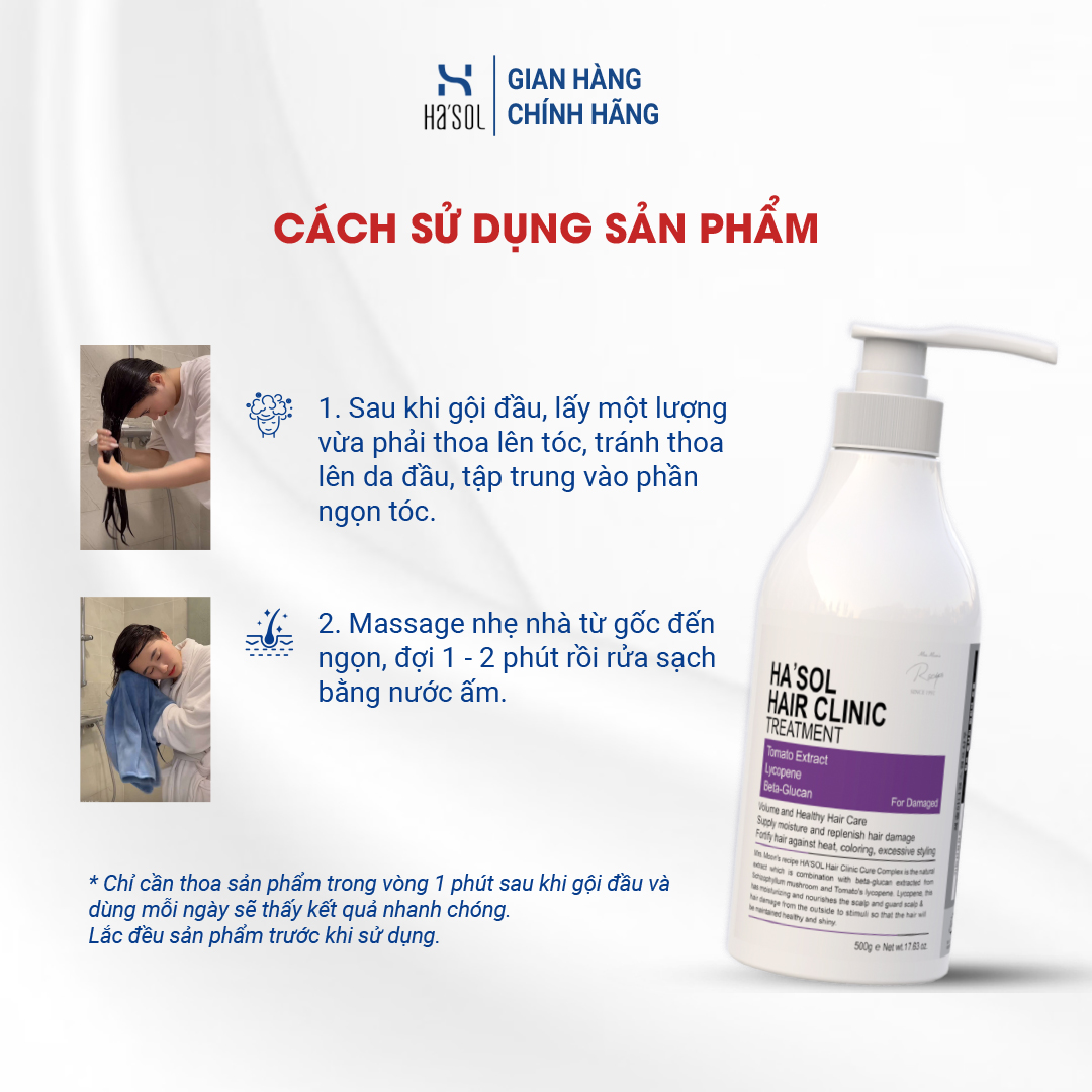 Hướng dẫn sử dụng: Sau khi gội đầu, thoa Kem Ủ Tóc Ha’sol lên tóc, tránh thoa lên da đầu, tập trung vào phần ngọn tóc. Để sản phẩm trên tóc trong 1-2 phút rồi xả lại bằng nước sạch. Để đạt hiệu quả tốt nhất, sử dụng mỗi ngày.